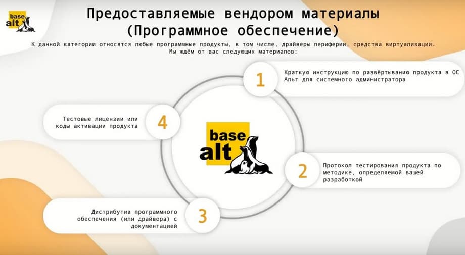 Смотрите, какие материалы необходимо предоставить в тех или иных случаях, чтобы мы подтвердили факт совместимости. Ну, если мы говорим о ПО, то это понятно, что это краткая инструкция продукта, инструкция системного администратора вашего продукта, протокол тестирования по методике, которую разрабатывает ваша компания. Это важный момент, потому что мы не производим ваше ПО, мы не можем знать, как его правильно эксплуатировать. Соответственно, дистрибутив, как я уже говорил. Дальше тестовые лицензии и ключи активации. При условии, что тестовая система предоставляет полный функционал, тогда нужны лицензии, код активации.