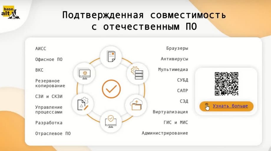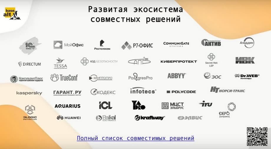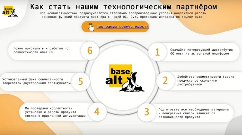 После чего, как только вы получаете сертификат совместимости, мы можем разместить вас на нашем сайте, также размещаем инструкции, и можно приступать к работам с Альт СП. Альт СП – это сертифицированная система, с ней чуть более сложно работать, поэтому мы рекомендуем всегда сначала добиваться совместимости с общедоступными операционными системами семейства Альт.