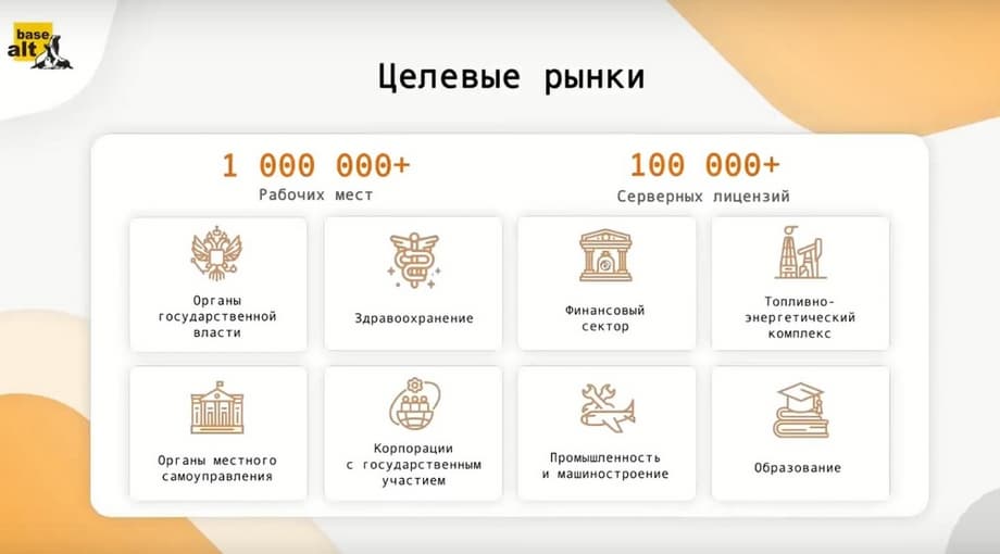 Какие наши основные рынки? Понятно, что малый и средний бизнес, они пока не в первых рядах переходят на Linux операционную систему, а вот компании с госучастием, органы власти, здравоохранение, образование, топливно-энергетический комплекс и так далее, какие-то крупные заводы, банки, они сейчас все согласно распоряжению правительства переходят на отечественное ПО, поэтому это наши основные целевые рынки.