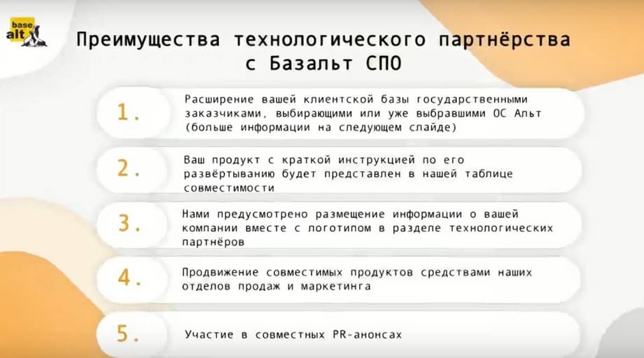Какие же преимущества дает технологическое партнерство с компанией «Базальт СПО»? Первым делом, как я уже говорил, вы однозначно расширяете свою базу потенциальных клиентов. То есть понятно, что сейчас уже наше ПО находится и эксплуатируется в очень многих организациях. Поэтому если вы хотите, чтобы ваше ПО дальше эксплуатировалось, то конечно лучше, чтобы оно было совместимо с продуктами Базальта и это сильно упростит жизнь.