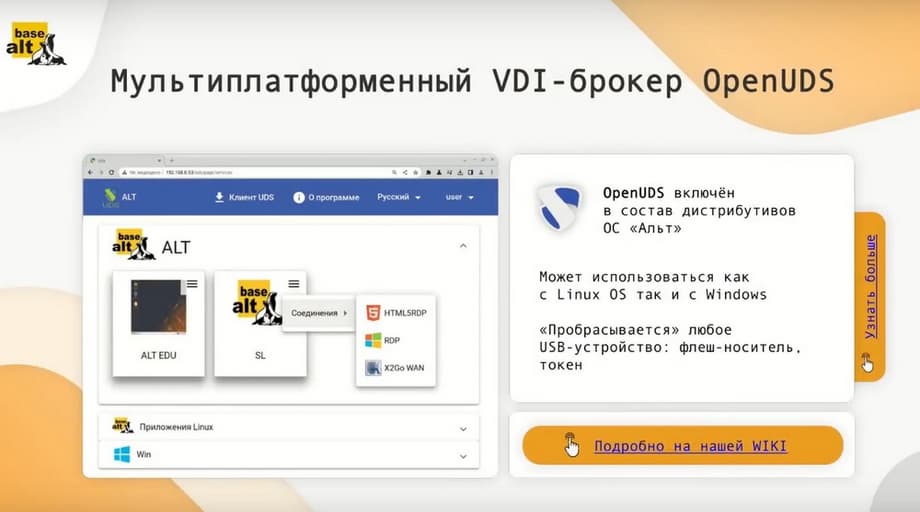 Хотелось бы отметить мультиплатформенный VDI-брокер OpenUDS. Он нужен в тех случаях, когда в облаке виртуальных машин уже много. И чтобы не возиться с каждой машиной отдельно, он позволяет систематизировать работу с большим количеством виртуальных машин. Ну понятно, что нам с вами, может быть, это мало что говорит, но администраторы, именно сетевые администраторы любой компании, они понимают, о чем речь, и для них это важно.