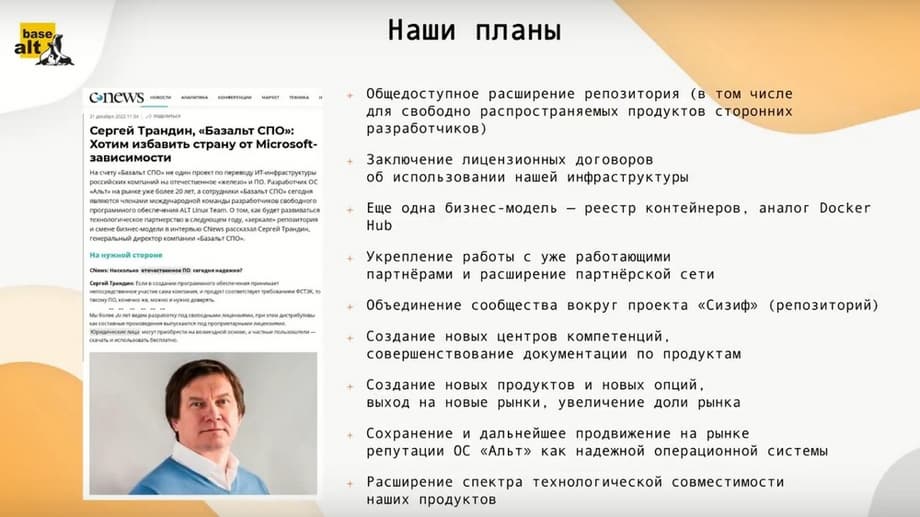 Наши планы, куда мы смотрим дальше и что мы хотим делать, куда двигаться. Мы очень активно смотрим в сторону контейнеров, очень активно сейчас у нас сегодня уже выпущен продукт Альт Домен, в ближайшее время он появится на рынке. Также мы очень с большим энтузиазмом смотрим на объедение вокруг проекта СИЗИФ, это наш репозиторий. На этом моменте я хотел бы остановиться, потому что есть очень разные системы адаптации вашего ПО под Альт Linux. Они не всегда включают в себя просто адаптирование ПО и его запуск. Например, один из вариантов, если ваша ПО свободное, свободная лицензия выпускается, вы можете его просто собрать для репозитория СИЗИФ. Оно попадет в СИЗИФ, если будет большой интерес со стороны заказчиков, он потихоньку мигрирует в P10. Это те самые общедоступные лицензии, которые лежат на нашем сайте. И далее также может попасть и в сертифицированный релиз. Ну после, разумеется, всех проверок.
