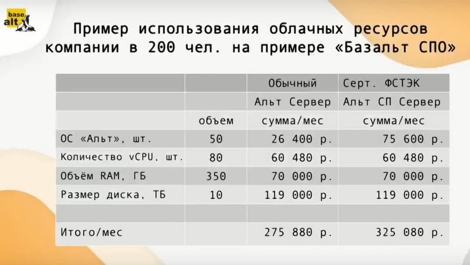 Второй момент, облачные провайдеры не торгуют годовыми лицензиями, так как это делает остальной рынок. Там тарификация у кого-то посуточная, у кого-то почасовая, у кого-то помесячная, у кого как. Но наши тарифы, они такие, что по итогам целого года конечный пользователь оплачивает те самые деньги, если купил годовую лицензию на рынке. Разницы никакой нет. Работа по этой схеме, которая называется pay-as-you-go, она для заказчика удобнее, но и если вы также будете продавать в этом же формате наши операционные системы, это плюс в оборот.