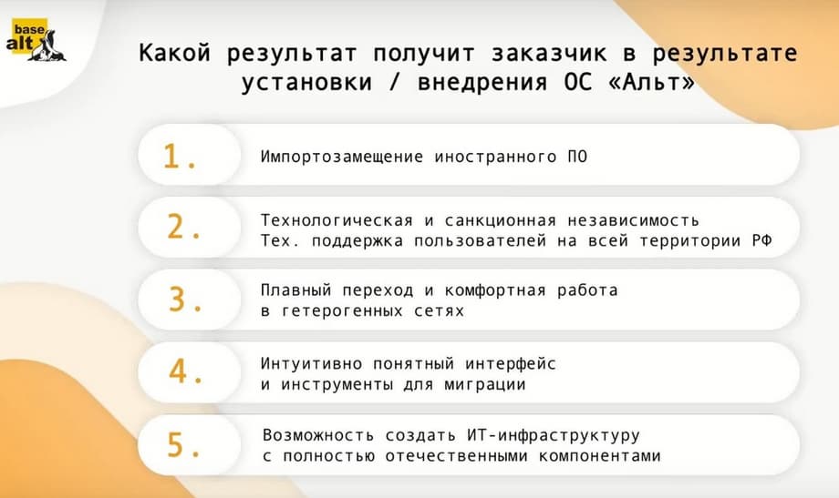 То есть какой результат получит заказчик в результате внедрения наших информационных систем в облаке? Выполнение распоряжения правительства об импортозамещении, потому что наши, в том числе и облачные, серверные операционные системы включены в реестр отечественного ПО. Второе, это поскольку у нас есть свой репозиторий, находящийся внутри страны, полностью отсутствует риск того, что нас от его отключат. Третий – это плавный переход с иностранных операционных систем на нашу. Интуитивный, понятный интерфейс, интуитивный, понятный инструмент миграции и возможность создать IT-инфраструктуру с полностью отечественными компонентами.