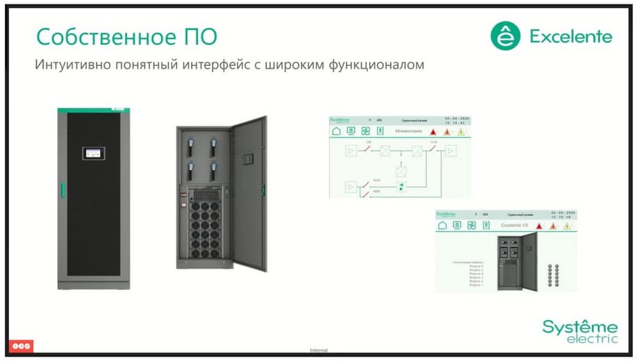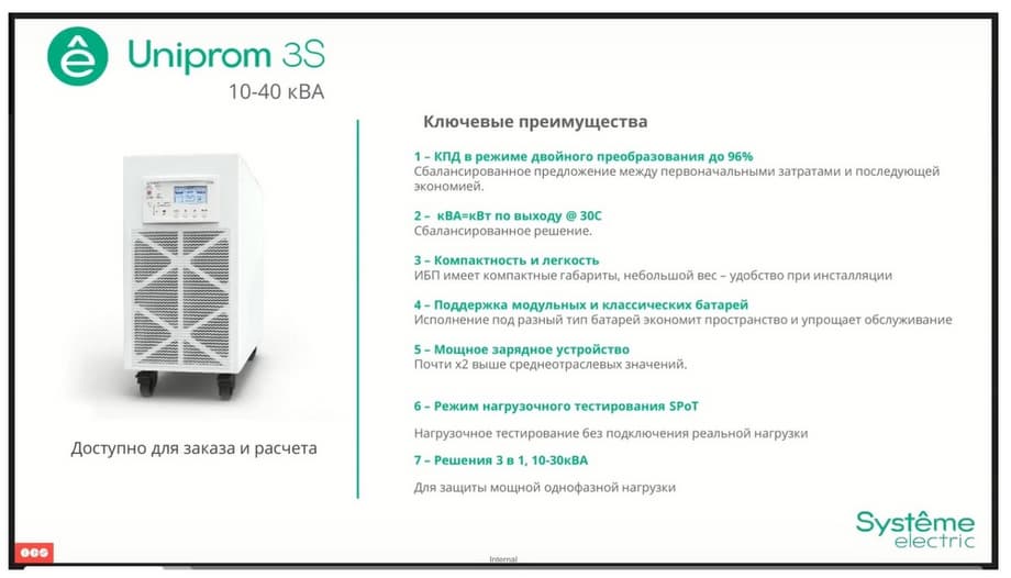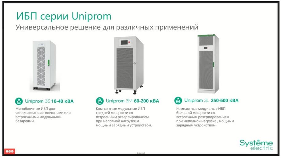 What is their key difference? Uniprom is a complete analogue of the previously known Ease line, which is implemented by Schneider Electric. The Systeme Gutr line is our novelty. These devices are designed for use in industrial operating conditions and have options in demand in this segment, such as increased IP31 protection and a built-in isolating transformer at the output. And the Excelent series is a line that we introduced last year. These are modular uninterruptible power supplies that support hot-swapping of all major elements. Their prerogative is the largest IT players in the market, banks, and other customers who are particularly demanding on equipment maintenance time. Let's start with the junior Uniprom line.