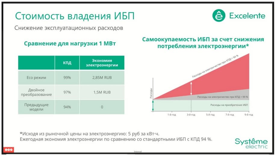 Now about efficiency. Here, the VX series is taken as an example, the efficiency of which reaches 97%. And, if we compare this efficiency with a model with an efficiency of up to 94%, then throughout the entire life cycle, the saved funds will help the end customer to eventually accumulate the necessary capital for a complete upgrade of the uninterruptible power supply system, which gives a significant advantage in terms of savings.