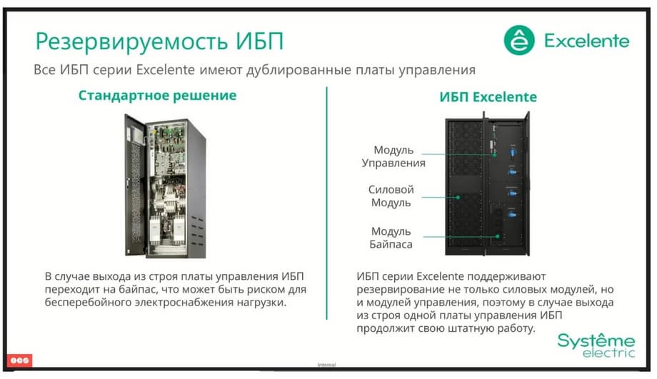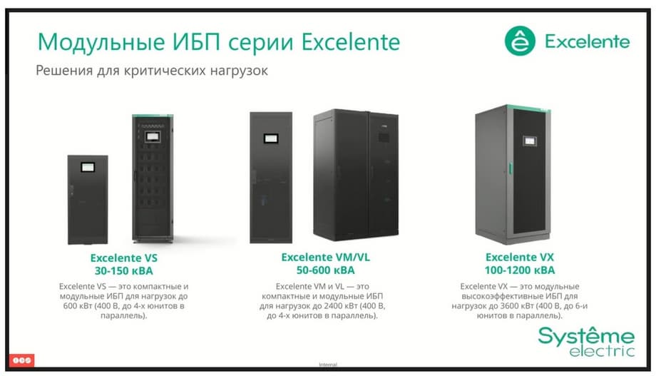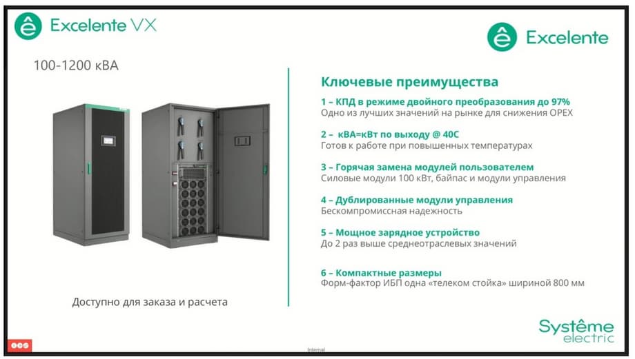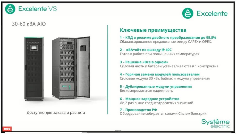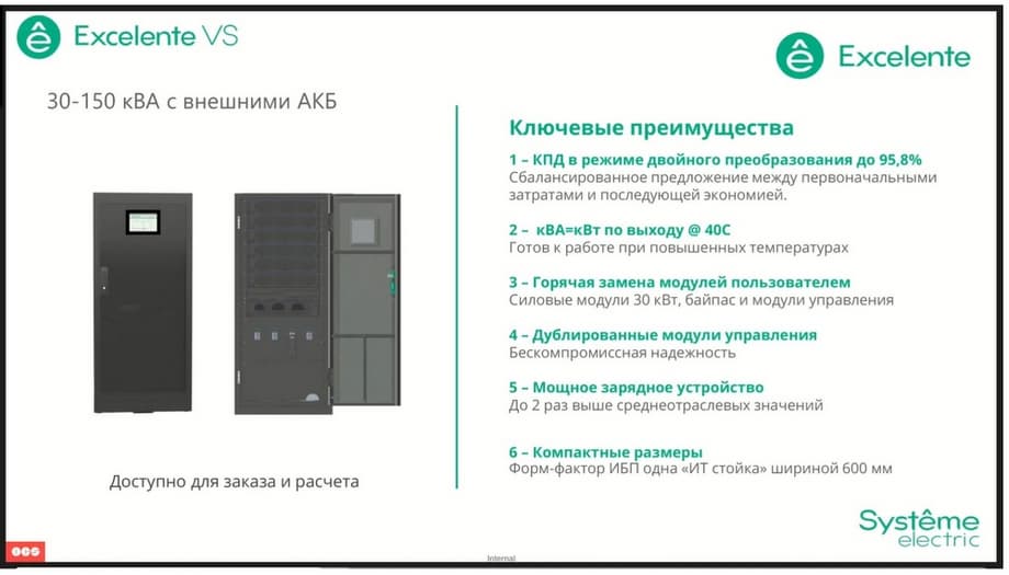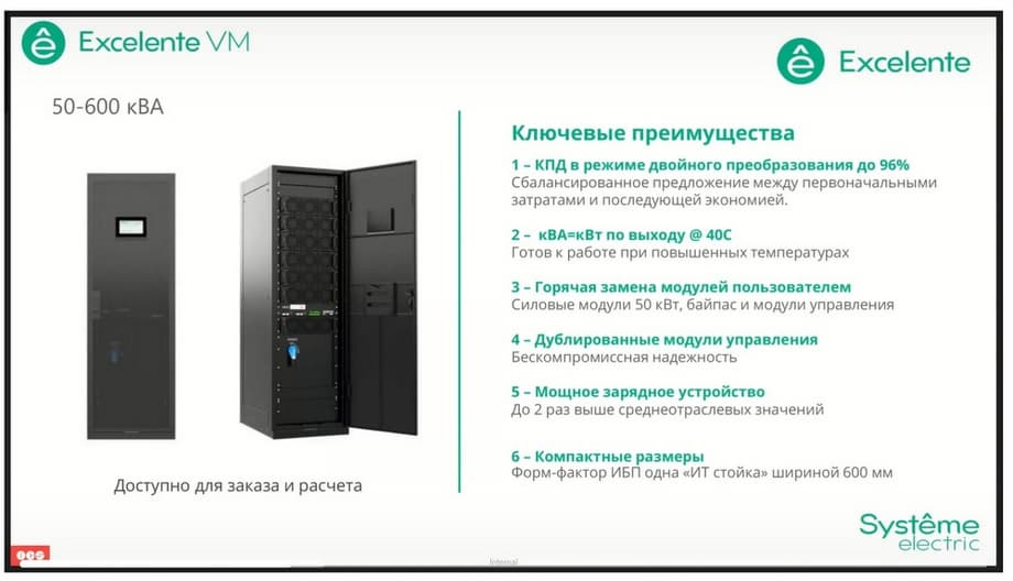 The Excelente VS series, the junior line among the UPS modules. Here, the 30 kW modules, here the switch kit is pre-installed in this UPS. Efficiency reaches 95.8% in online mode, hot-swapping of power modules, bypass modules and control modules are fully preserved. And it also occupies 600 mm in width. The only key difference here is that the model with external batteries is designed for 150 kilowatts, but at the same time we have the ability to install up to 6 power modules simultaneously. This allows you to achieve additional reserve. That is, the output power can be 150 kilowatts, while in the event of failure of one power module, we do not risk interrupting the power supply to the load, since the backup module will take over the work completely.