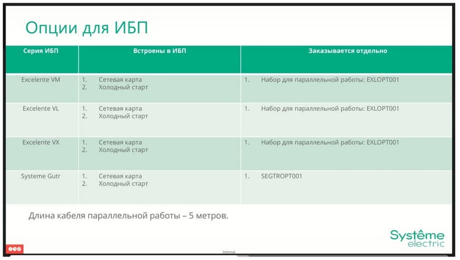 As for options, the situation is similar to Uniprom. The "Cold Start" network card is included in the default package. The only thing that is ordered separately is a set for parallel operation. For all Excelente, one type of reference, for Gutr, respectively, its own independent reference.