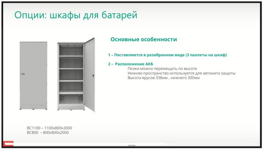 At the bottom of the battery cabinets, we have a mounting plate installed for installing the battery protection circuit breaker, which allows you to install both the battery and the kit itself in the battery cabinet, which saves space. The battery cabinets themselves are manufactured and supplied in two sizes. This is a width of 800 mm and a width of 1100 mm. At the same time, these cabinets are universal. The shelves inside these cabinets can be easily moved in height to install various batteries, ranging from small capacity to the largest.