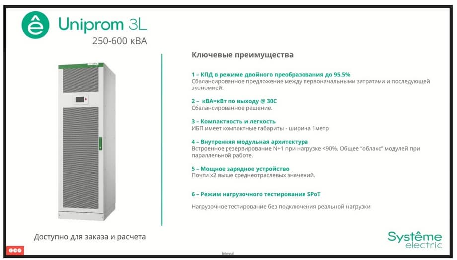 The average power range is from 60 to 200 kilowatts. The key difference of this line is that it can be supplied both in a compact design with the use of external batteries, and in a larger case, but which in turn will support internal modular batteries, which we assemble at our production site in Technopolis. These UPSs have similar characteristics in terms of efficiency, output power factor, and internal modular architecture, as described for Uniprom 3L. And this group also supports the load testing mode without directly connecting the load.