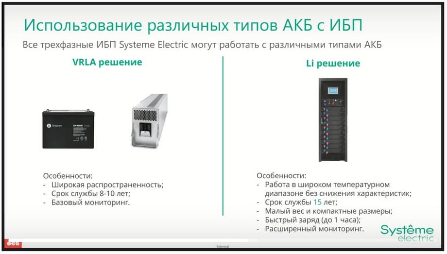 Let's start with batteries. The solution is divided into lead and lithium. If we talk about lead, then its feature is widespread. The service life of such batteries is 8-10 years, it supports basic monitoring, or advanced monitoring with the help of additional accessories. As for lithium, it has a longer service life, up to 15 years, more compact dimensions and light weight. And in the basic version, it supports advanced monitoring. It also supports fast charging, up to 1 hour, and operation in a wide temperature range. Returning to the lead solution, it should be noted that our company can carry out deliveries in several sizes. We can supply batteries in the form of traditional blocks installed in battery cabinets or on battery racks. We can also supply battery modules that are installed either in the Uniprom 3S, 3M or Excelente 3S series UPS, or installed in external battery cabinets for modular batteries, which we are currently developing. And modular batteries are produced by our own forces in Technopolis, we support them on stock, also in the case of implementing any project, they can be quickly shipped together with the UPS if necessary.