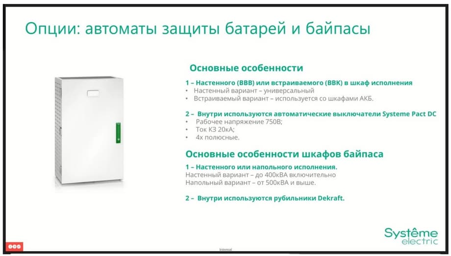 Options: "Battery protection circuit breakers and bypasses". We manufacture options for both wall-mounted (ВВВ) and built-in (ВВК) cabinet versions. Their key advantage is the use of our Systeme Pact DC automatic circuit breakers for currents from 100 to 630 amperes. On external bypasses, we use either Dekraft switches or Systeme Pact DC, which allows us to completely close the production of our equipment on our own circuit breakers and on our own switches. This allows us to significantly reduce the time due to the fact that we use a single warehouse and quickly ship both accessories and UPSs to our customers.