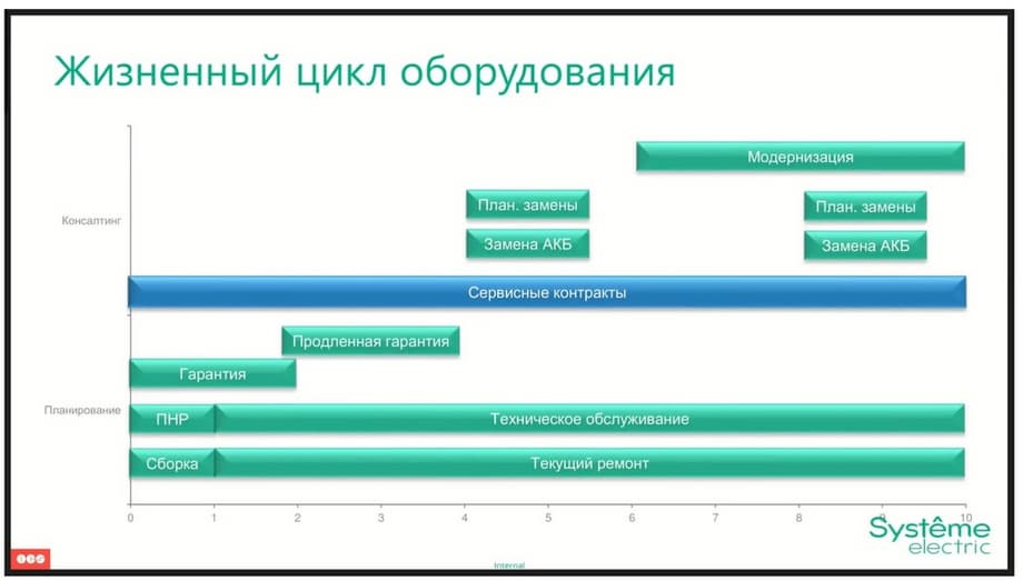If we demonstrate this work on a graph, we can see that Systeme Electric with our forces can implement commissioning, assembly, provide warranty service, post-warranty service within the framework of an extended warranty. In the middle of the life cycle, carry out planned replacements of equipment parts that require it. And at the end of the life cycle, modernize the equipment and replace it with a new one.