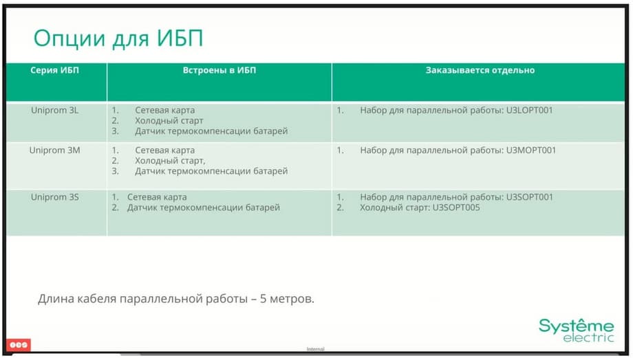 As for options, here we pre-install network cards and battery temperature compensation sensors in all UPSs. As for the cold start, it is also pre-installed by default for the Uniprom 3M and 3L series, and is ordered separately for the Uniprom 3S series. At the same time, the only accessory that is purchased separately for all series is a parallel operation kit. This is due to the fact that the customer does not always plan to buy two or more UPSs to connect them in parallel. Because of this, this accessory is placed in a separate line and is purchased in multiples of the number of UPSs that the customer plans to connect in parallel.