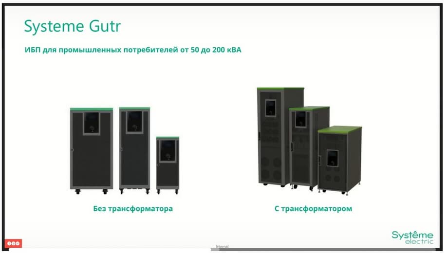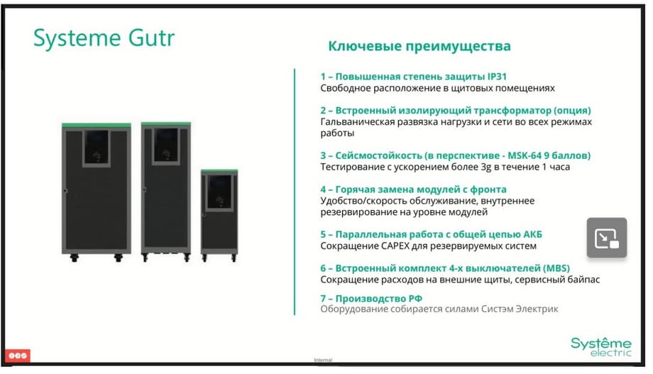 And all UPSs of the Systeme Gutr line are implemented in a protected IP31 case. What are the key advantages? In addition to the transformer and increased degree of protection, this is seismic resistance, hot-swapping of power modules from the front, parallel operation on a common battery, a built-in complete set of switches, which allows you to reduce the cost of external shields and production in the Russian Federation. We are also currently in the process of obtaining certificates. And we consider this our advantage due to the fact that assembly in the Russian Federation allows not only to load our capacities, but also to significantly reduce the delivery time of this equipment, due to the fact that we store components in our warehouse.
