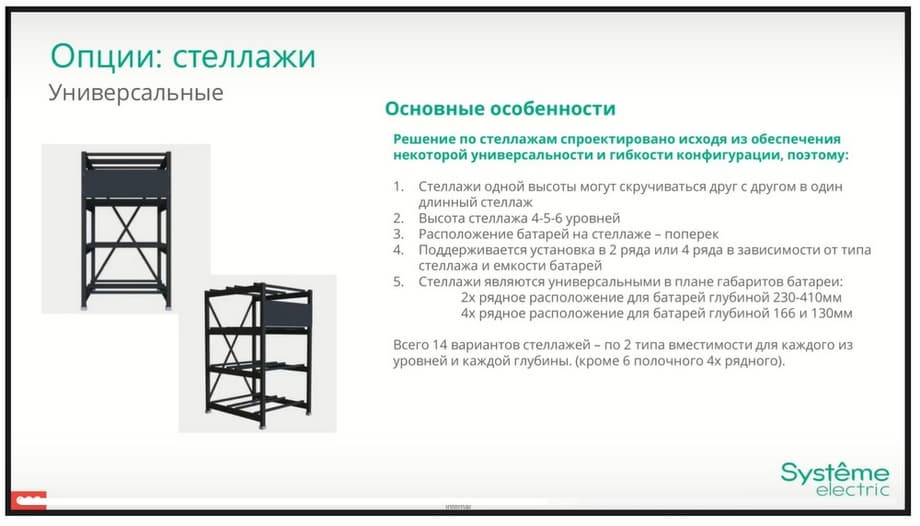 The next option that we implement is racks. Racks in our nomenclature are entered within the framework of standard articles in the amount of 14 pieces. At the same time, in the case of implementing any complex project, we always have the opportunity to develop and agree on some version of a custom rack, providing for placement in specific spaces, for example, in narrow rooms, or some other limited spaces where it is planned to place the battery. There has already been experience in such implementation, and the experience has been successful. Therefore, in the case of a non-standard project, we are ready to compromise and implement custom options.