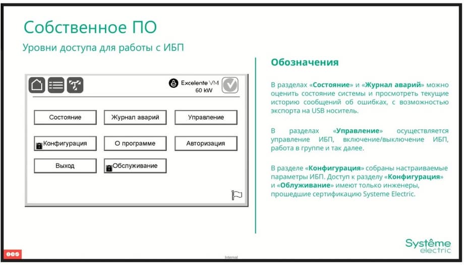 Also, our software implements several levels of access depending on the qualification of the specialist. For the user, one menu functionality is implemented, allowing you to view the status of the UPS, view the alarm log, control the UPS, and view the firmware version. For a service specialist, during maintenance, an additional password authorization is implemented, and this access level allows the service specialist to change the UPS configuration if necessary and carry out its service or repair maintenance.
