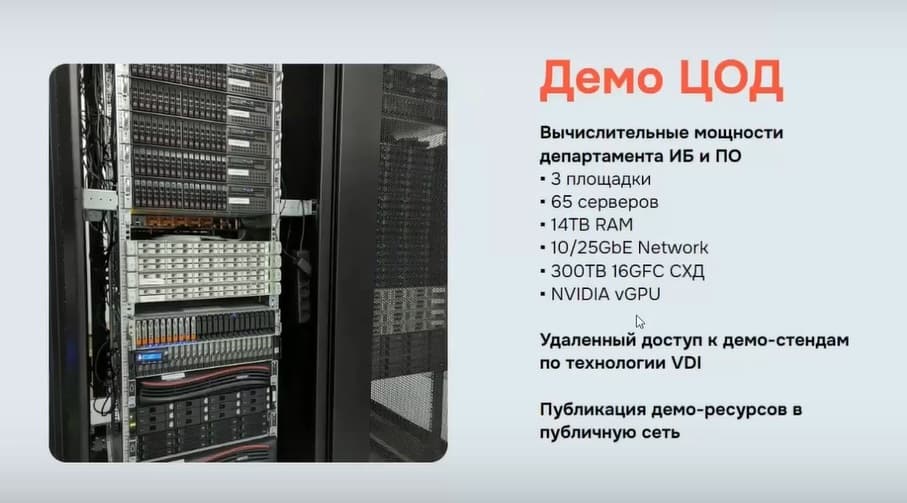 Three sites, 65 servers, 14 TB of RAM and good networks, working normal storage systems, we have graphic cards. And we provide remote access to these stands via VDI technology.