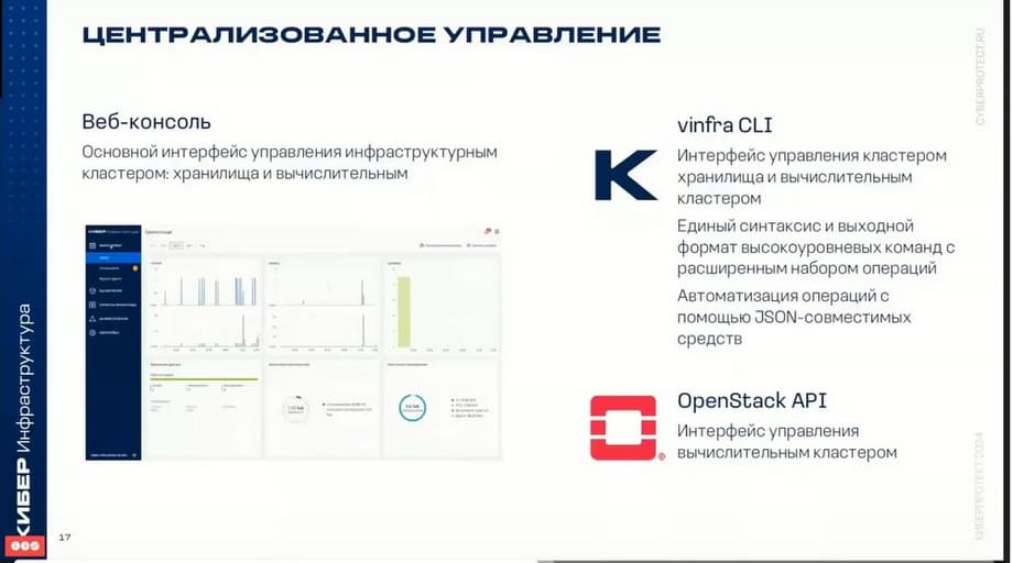 Infrastructure is managed in various ways. For this, there is the main tool - a web interface, a command line, the so-called vinfra CLI interface and also the OpenStack API, the OpenStack software interface. The Web console is the main visual interface for managing the compute cluster and the storage cluster. Through the Web console, server management, networks, users, self-service, roles, security, etc. are available.