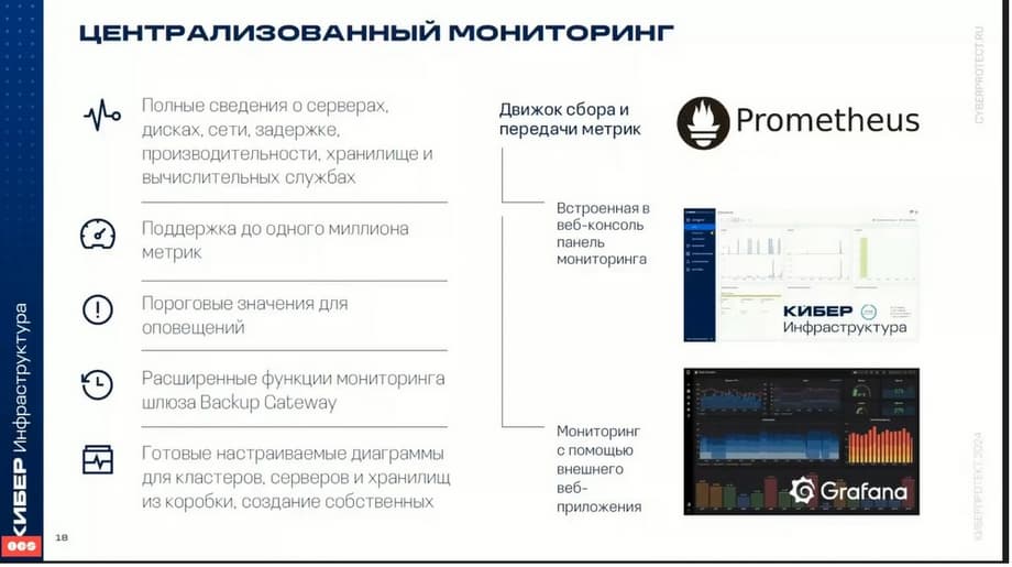 Also they use the Prometheus monitoring system for cyberinfrastructure. And also with the help of the external web application Grafana, you can view detailed diagrams for clusters, servers, storage. And it is possible to create your own monitoring panels and diagrams.
