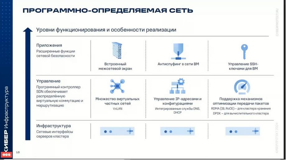 Cyberinfrastructure supports virtual switching based on OpenViSwitch. The OpenViSwitch switch runs on each compute node, redirects network traffic between virtual machines on that node, as well as between virtual machines and infrastructure networks, i.e. between other nodes. Distributed virtual switching provides centralized monitoring, configuration management on all nodes of the compute cluster. Distributed virtual routing allows you to place virtual routers on compute nodes and redirect virtual machine traffic directly from the placement nodes. In the scenario, the IP address is used directly, assigned to the network interface. If S is used, traffic is redirected through management nodes. As you know, the technology inside OpenStack, as in cyberinfrastructure, uses VxLAN technologies for virtual networks. This technology allows you to create logical L2 networks in L3 networks by encapsulating over UDP packets. There is also integration with DNS and DHCP services. You can use RDMA over InfiniBand for the storage cluster, for organizing the internal storage network. The internal storage network is just used for organizing the storage. It can be built on the basis of RDMA.