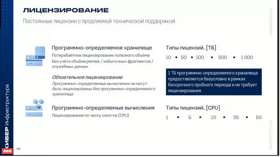 Licensing. Storage is licensed by terabytes, and it is licensed specifically for usable space. As for virtualization, it is licensed by the number of server sockets. It should be said that in order to deploy in a test environment, a free license for 1 TB is included, it is included in the trial version.