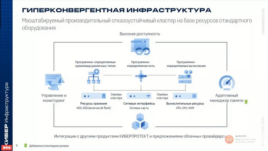 The basis of cyberinfrastructure is a very simple idea. Servers are taken, they can be from different manufacturers and different configurations. These servers are connected by network interfaces, connected to the external and internal network. The internal network is used for communication between nodes and for cluster interconnect, and is used for data storage. Software is installed on the "bare metal" , which combines these servers into a reliable, high-performance, fault-tolerant cluster. All resources of these servers - computing power, memory, and storage are combined into a single pool. Cyberinfrastructure is based on the Linux operating system. The distribution includes the operating system, although there are options when you can install the operating system separately, and the cyberinfrastructure software itself can be installed on top of the operating system. However, most often all this is installed at the same time. A single cluster of combined servers is easily scaled by adding nodes and individual disks.