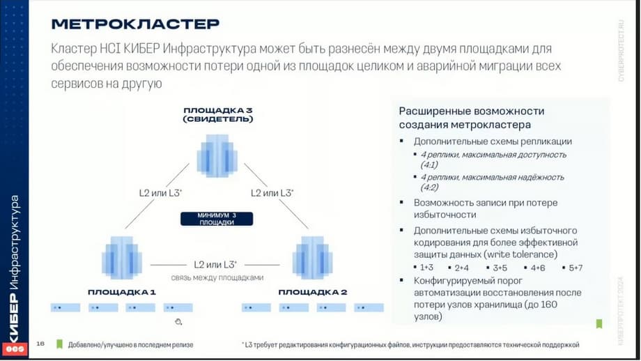 Metrocluster. In one of the latest versions, it became possible to build a metrocluster, i.e. to separate the cyberinfrastructure nodes between different sites to eliminate the possibility of losing the site entirely.