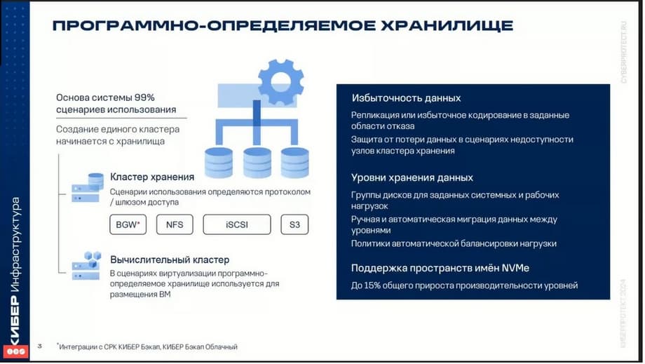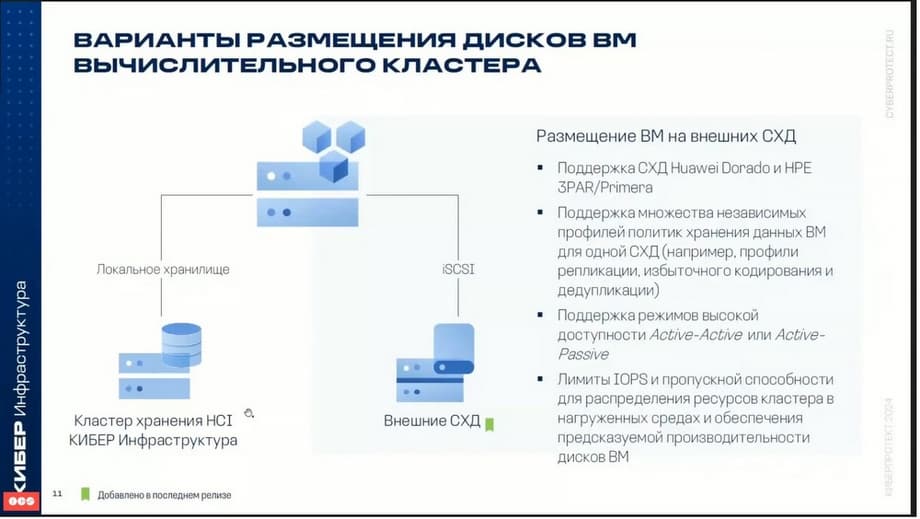 The simplest and most obvious is when virtual machine disks are stored in the same cyberinfrastructure storage. But you can also use external storage disks in it. This was added in the latest version. Currently, two storage systems are supported. These are Huawei Dorado and HPE 3PAR. It works the same way as in VMware. An analogue of what was called Vivo in VMware. That is, on the storage system through the API on the storage system, the cyberinfrastructure can create the necessary disks and connect them to the virtual machine on external storage systems through the API. This is how it works.