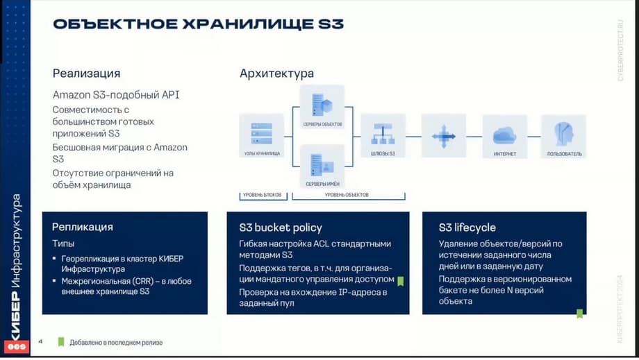Object storage is optimized for storing billions of objects, data, and applications, you can store various static web content, online storage service data, big data, backups, etc. The key difference compared to other types of storage that are used in cyberinfrastructure is that parts of an object cannot be changed. That is, when an object is changed, a new version of it is created. Cyberinfrastructure can store replicas of S3 cluster data and keep them up to date in multiple geographically distributed data processing centers. That is, there is the possibility of geo-replication from one storage to another. Thus, they can be used for data disaster recovery.