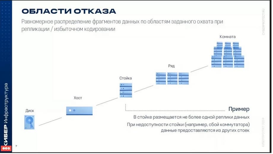 A disk, host, server, or even an entire rack can be selected as a failure zone. In this case, the data is distributed between the individual components of the same level. That is, between disks, between servers, but most often this happens specifically between servers. I will show where the data is distributed between different servers. Thus, the failure of one or even two servers does not lead to data loss. If a component fails, for example, a server, the data that was on this server is redistributed to other servers. That is, if there were any copies of data on the server that failed, then these copies of data will be distributed to other servers in such a way as to maintain the level of fault tolerance. That is, if the level of fault tolerance, for example, replicas, two or three, then the data will be redistributed in such a way as to ensure the required level of data protection. Well, and, of course, it also depends on whether there is free space in the cluster at the same time.