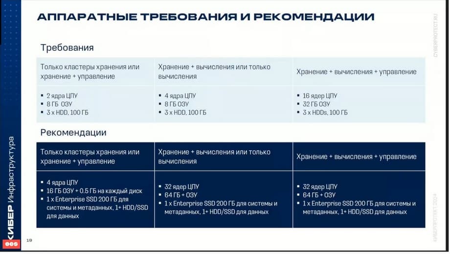 It must be said that in order to choose which servers to use, it is necessary to conduct some sizing. In order to evaluate the sizing, you need to understand whether this cluster will only have storage or whether it will simultaneously have both storage and computing infrastructure, i.e. virtualization will be raised. In order to determine, for example, how many CPUs and memory to take, it is also necessary to understand whether this will again be a storage thing or virtualization. If it will be virtualization, then you need to estimate some maximum amount of virtual processors that is needed for virtualization, and the maximum amount of memory. For storage, you need to understand what types of data storage will be used, i.e. what services will work. Each service requires some of its own parameters.