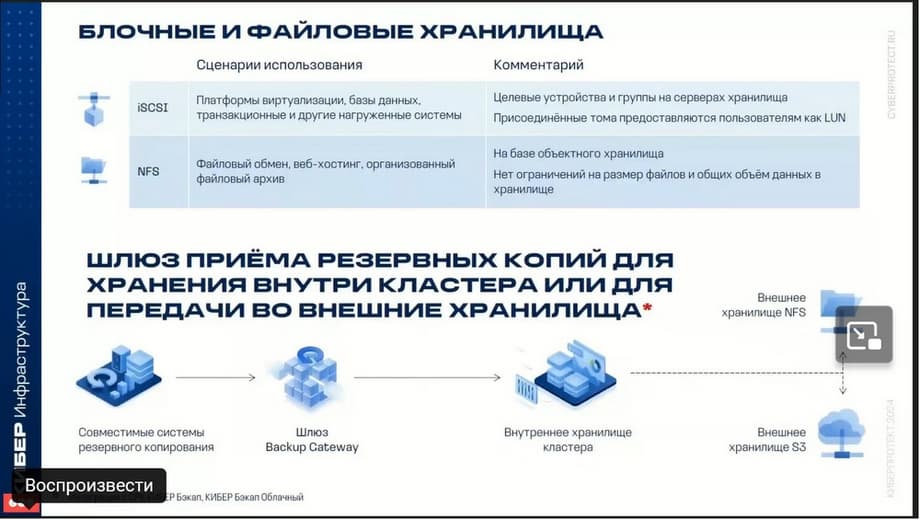 Block and file storage. First of all, it makes sense to talk about iSCSI and NFS. These are the main additional systems of storage type. iSCSI is recommended for virtualization of databases and other workloads. For example, databases and transactional systems. Data exchange with the storage occurs quickly due to providing high read and write speeds. Additional tools can be used to increase speed, such as RDMA, which runs over InfiniBand, but this is specifically to ensure high storage performance.