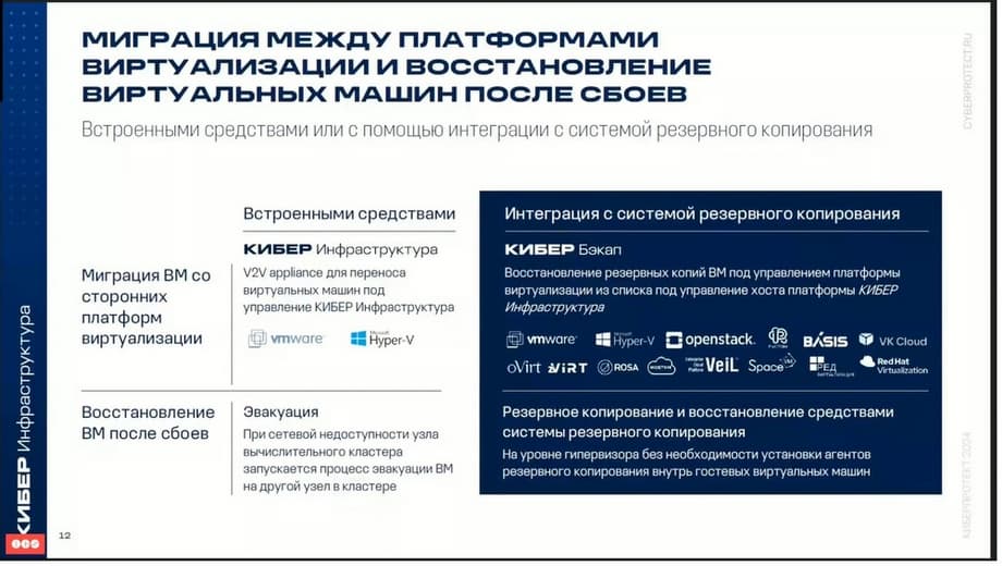 The virtualization system provides high availability of virtual machines. That is, if a server node on which a virtual machine was running fails, it can be evacuated to another node. For transferring virtual machines between nodes, there are modes of both cold migration and hot migration. In one of the latest versions, the possibility of DRS was introduced - this is the possibility of balancing the load on CPU and memory. This feature allows you to automatically, without stopping, move virtual machines between virtualization servers to improve performance. This is also configurable. The administrator can, for example, exclude individual machines from this process or, conversely, include them.