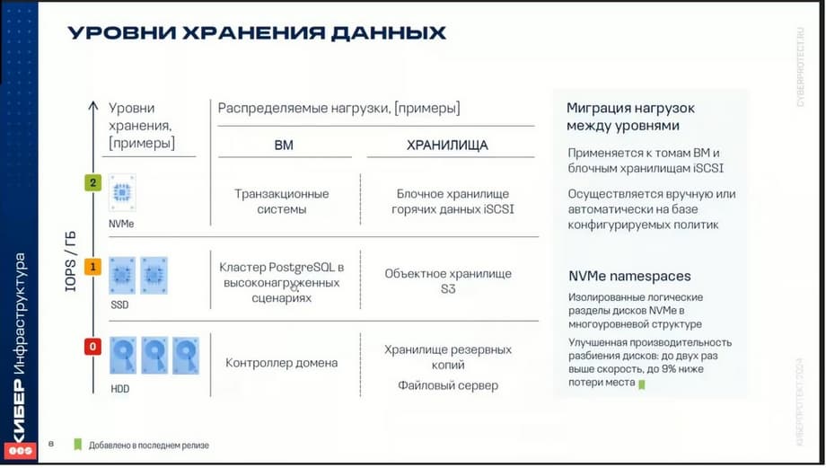 For example, here on the slide you can see that transactional workloads or hot data can be distributed to the tier where NVMe disks are located. The next tier is SSD disks. On it, for example, you can place database data or object storage data. On the third tier - the slowest disks. On this tier, you can store, for example, backups or some cold files.