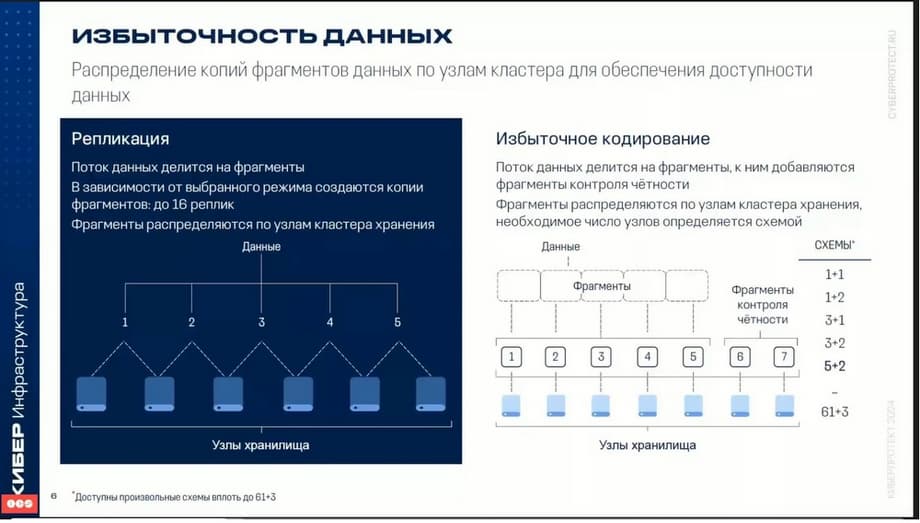 Replication is essentially data mirroring. Replication works as follows: the data stream is divided into separate blocks, each of which is stored in two or three places on other servers. Thus, there is data redundancy, either 100% or 200% data redundancy, but at the same time, maximum protection against failure is achieved. Redundant coding, or, in English, RG-coding, is a mechanism for dividing streams into separate blocks according to a certain redundancy scheme. Various schemes are used: 1+1, 1+2, 3+1, 3+2, 5+2,…, 61+3. Which scheme to use depends on the choice of various criteria. You can use it with maximum reliability of failure of two or more nodes, or you can consider more high-performance schemes.