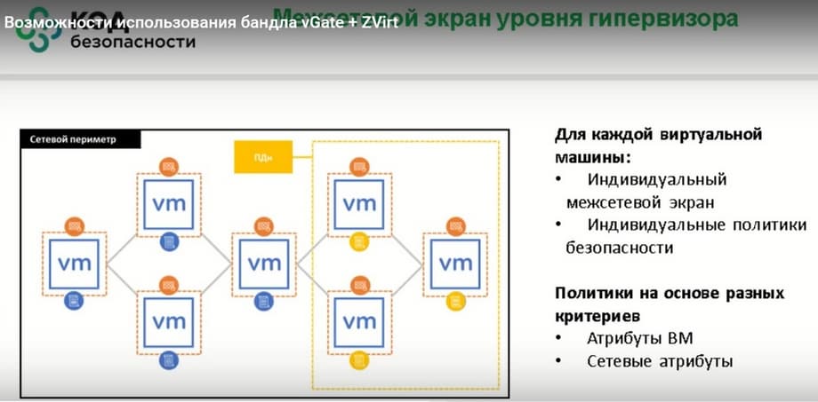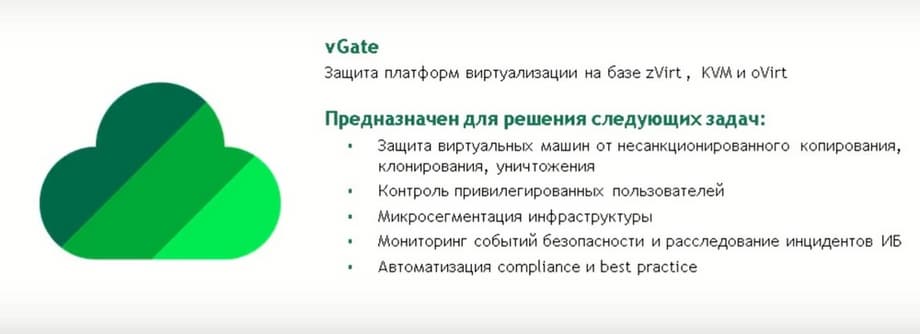 We offer a joint solution, where the non-certified version of zVirt offers all the functionality available to date, i.e. all new versions that are updated quite often. vGate acts as a means of protecting this virtualization, i.e. precisely as a means that protects both from the point of view of managing virtual machines and from the point of view of network microsegmentation. Because we have a network protection solution in the form of a firewall, which is certified by the FSTEC.
