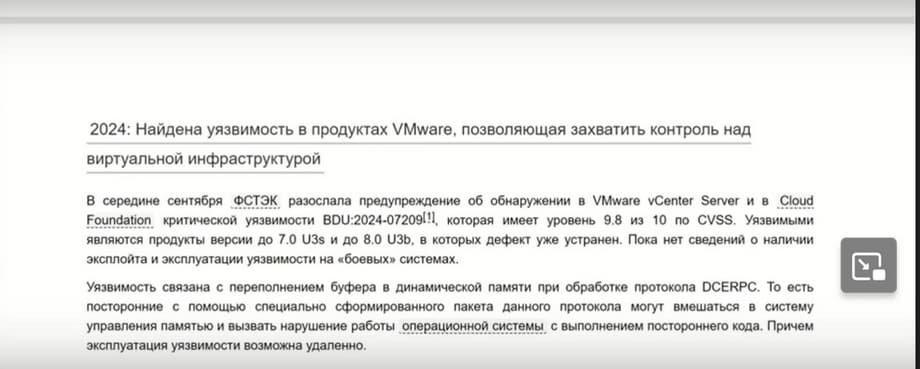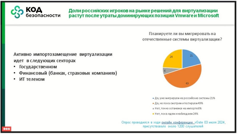 In addition, we understand that many are required to comply with various presidential decrees on migration to domestic infrastructure and ensuring protection. These decrees are caused by the need to protect infrastructure, critical infrastructure of financial and other organizations. Because the same VMware products have certain critical vulnerabilities, and there are quite a few of them. And all our critical infrastructure, everything that the state wants to protect, is drawn into domestic virtualization, which is updated and developed.