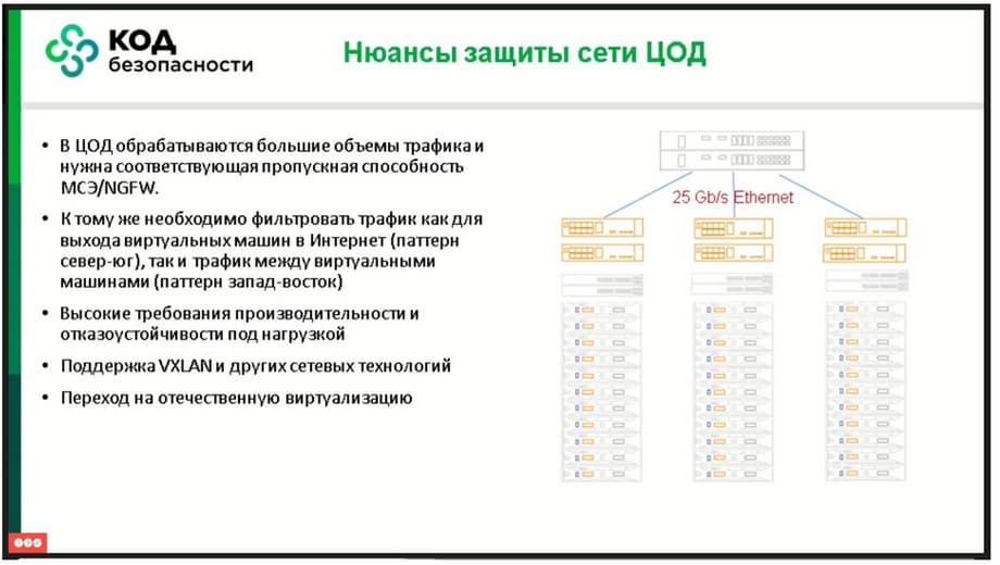 To date, our IT infrastructure consists of servers that use at least 10 gigabits. This is not so much a standard, the standard is still 25, but at the same time there is still a solution that uses 10 gigabits. On a good server, we have 2 by 25 gigabits, and on a high-performance server, which does not use everything on the third generation, but at least something new, and even if it is the sixth generation, where there are several hundred cores in one server, it is clear that 2 by 25 is already not enough, and therefore 4 by 25 is already used there. It is clear that all traffic is inside, and about 20% comes out to the top. Why is this needed? The main load is migrations, backups, processing. Somewhere the virtual machine just moves from one physical server to another, somewhere it tries to get more resources. That is, there are many tasks. Machines move, and it is clear that the traffic is large, because if we take even 50 gigabits from each server, and we have, say, at least 50 servers, then we already get quite large values. And if we have 100 gigabits and 100 servers, or even 200, then the value becomes quite frightening.