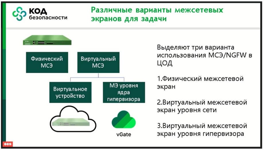 And the most, probably, high-load task, it is more related to information security, is when a virtual machine moves to another IP, to another physical server, and we need to manually rewrite the filtering and traffic rules. This imposes a certain restriction on the performance of information security employees, when there are many virtual machines and few employees. And they either do not have time to do all this, or they do it with some delay, which leads to certain vulnerabilities. If we are talking about a hypervisor-level firewall, which is in vGate, then it is carried out due to traffic filtering precisely at the hypervisor level as such, that is, it does not have any delays, it uses the virtual network card that is at its disposal, and does not introduce any additional delays, thereby greatly simplifying the infrastructure.