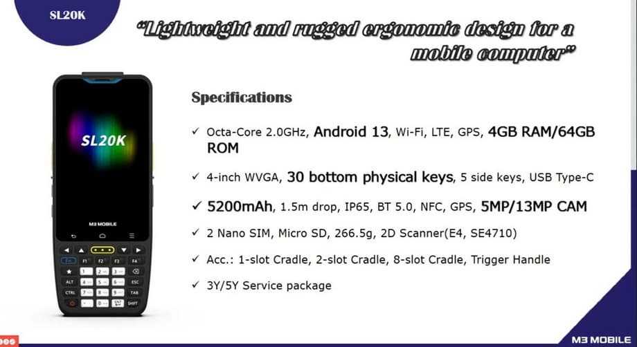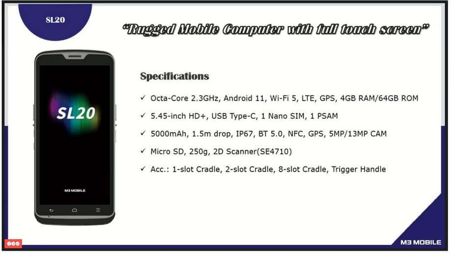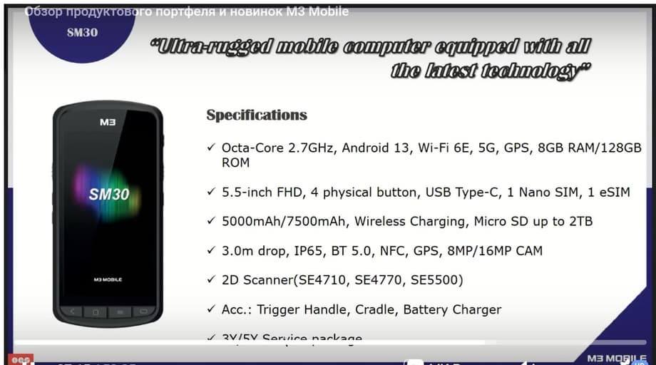 This is more for Europe than for Russia. We have one, maybe two or three of those who use the SM series in our country. These are usually some large factories that do not chase cheapness. They need to have an industrial device, well-protected, so that it has some of its own tricky options, etc. And what are the tricky options? Well, for example, they need to have a touch screen, a small light device, but so that it has a long-range SE5500 scanner. And due to this combination, several customers in Russia buy this device. They take the SM20 with the SE5500 scanner so that it can be read at long distances. In mass, retail will not take such things. That is, no one will work with shelves on a device of this class. Well, if you look at the specification, here is such a specification of 8 GB per 128, 5G, Wi-Fi 6, an eight-core processor of 2.7 GHz. That is, this can already be compared with such commercial flagships that cost around a thousand dollars plus or minus, a 7500 mA*h battery, that is, this is a top device with huge capabilities, potential built into it, microSD there up to 2 terabytes, etc.