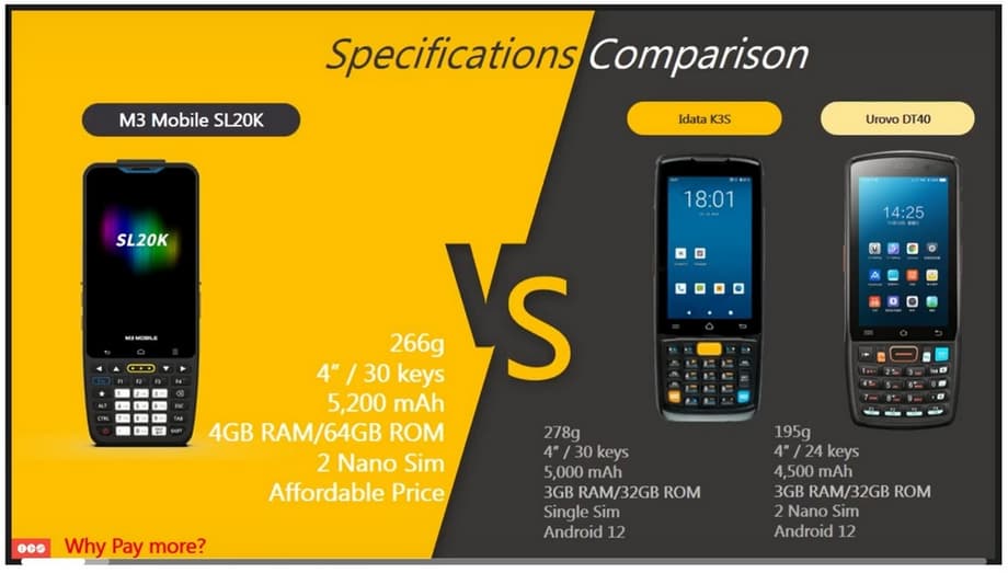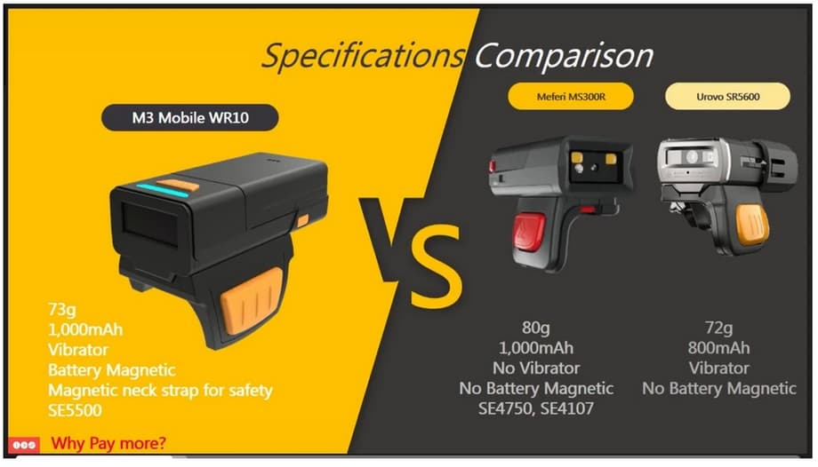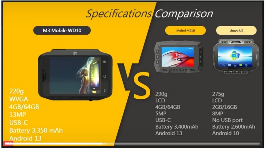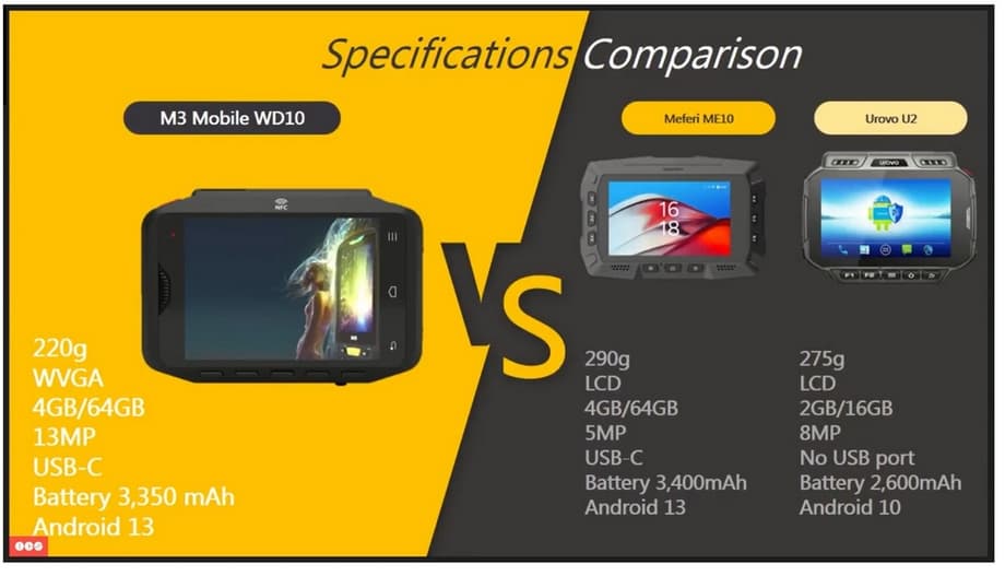 In terms of dimensions, it is something similar to the U2, only here the battery has a larger capacity, the camera is 12 megapixels, and the impact resistance is better. A number of our customers have tested these devices for resistance to impacts and drops. One of the requirements is that the battery does not pop out when dropped. This requirement is from Perekrestok and Pyaterochka. Magnit is less demanding on this, well, the battery fell out - it's not scary. But Perekrestok is worried that the battery falling out of the device during a fall can create an emergency situation in the warehouse where the forklift is driving. So, the WD10, according to them, performed better than all the competitors they are currently testing during drop tests. The competitors are Urovo U2 and Meferi ME10, they are shown in the photo.