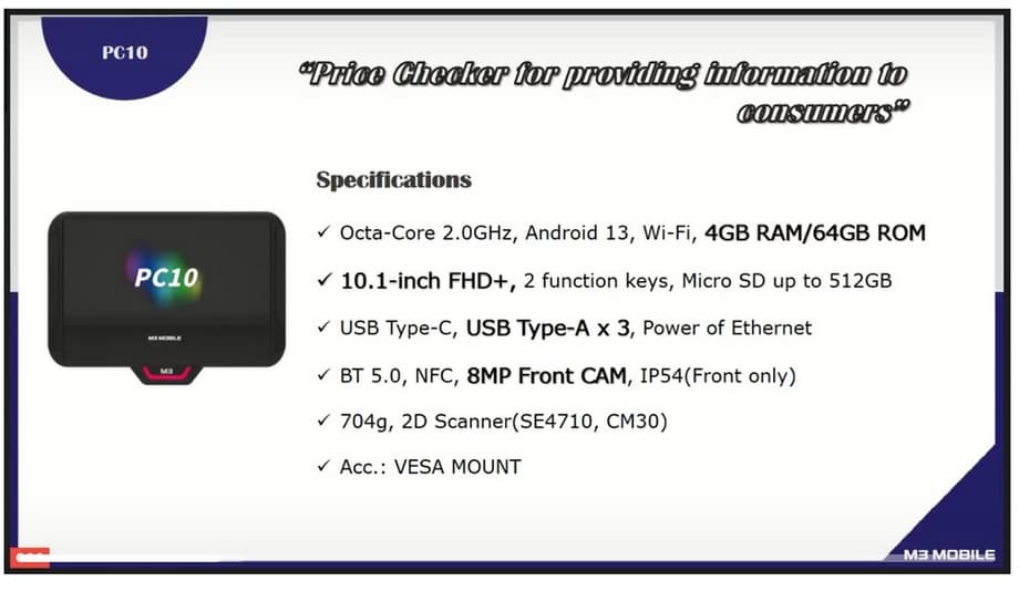 Price Checker. For a long time, we sorted through the options of what Price Checker to make? 5 inches, 10 inches, 8 inches, 7 inches. There were a lot of options. As a result, we turned like a weather vane, watching what our potential customers wanted. These are Magnit, X5, Dixy, and many others. As a result, we settled on a 10-inch tablet. A PC tablet that is well protected. In principle, it is not thrown, it is nailed to the wall. To drop it, you need to tear it off the mount. But, nevertheless, it is made well enough, it has an impact-resistant case. The scanner that we use here is the Zebra SE4710 scanner. In principle, there are options with other scanners. We considered scanners from NewWorld and scanners from the Chinese. But we settled on the Zebra, because the customers who are testing this price checker impose quite strict requirements in their technical specifications, technical regulations for the price checker. The Zebra SE4710 fully satisfies us, despite the fact that it is a rather old scanner, but it works very well in a wide range of distances and in a wide range of any barcodes. That is, it reads everything, the smallest, the largest, the medium, and even the damaged barcode. Therefore, we left the SE4710 as one of the main configuration options. Well, there are also cheaper SM30s.
