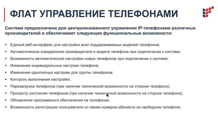 The auto-provisioning service allows you to centrally configure and manage a fleet of telephone sets. Centralized management includes automatic configuration, configuration, status monitoring, firmware updates, scheduled maintenance, reboots, etc. on a schedule, changes to the same type of different settings. That is, a full-fledged auto-provisioning service, which is included in the register of the Ministry of Digital Development.