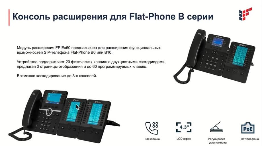 The expansion console is universal, it is suitable for both B10 phones and B6 phones. This is the same console, it can be connected directly from the phone of one model to the phone of another model. In the B6 model, up to three consoles can also be connected in cascade. And the difference between the B10 and B6 models is in the size of the display and in the number of BLF keys on the telephone set. In all other respects, these phones are absolutely identical in functionality, so we have a universal console suitable for both models at once.
