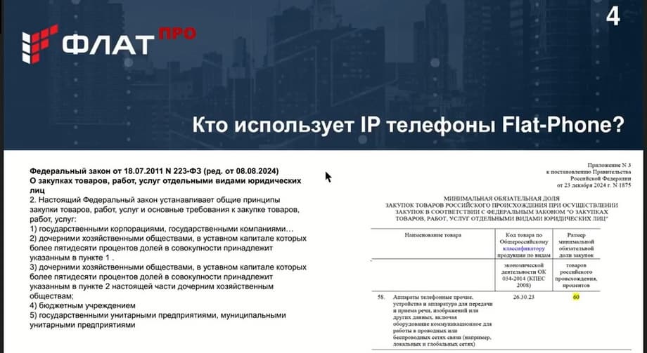 Government decrees streamline who should and who should not use TORP solutions, what's new and what's interesting. Here is decree 1875, which was issued on December 24. Not everyone knows how to work with it yet. There is interesting news there, so I will also tell you about it. According to the latest decree, all categories of companies that are required to purchase TORP phones have the right to purchase them in a share of 60% of equipment from the register and 40% of equipment from outside the register. Last year, the standard was 50 to 50. This year, the share of TORP phones has increased by 10%. But at the same time, there is an excellent reservation in this decree that this delivery of 60 to 40 can be carried out within the framework of one purchase. That is, they immediately have the right to buy 60% of TORP phones within the framework of one purchase, and take non-TORP phones for 40%. Since our line also includes both TORP phones and non-TORP phones, which are much cheaper, that is, we can offer customers to optimize the budget, while ensuring a monovendor supply. Last year, our customers, when supplying 50 to 50, usually took 50 to 50, where it was considered not from the quantity, but from the amount of the purchase. Therefore, they usually take some amount of the most expensive phones, they close this 50 - 60 percent, the amount required by law for the supply, and then close the rest of the amount with inexpensive phones, but in a larger quantity, ensuring that they close their task and comply with the law. Not everyone knows about this rule. I explain all this on my fingers so that merchants and presales understand. But for lawyers and everyone else, we have excerpts from laws with article numbers and everything else. We have made this selection, you can give them the document so that they can figure it out themselves and explain to the customer how to work with it.