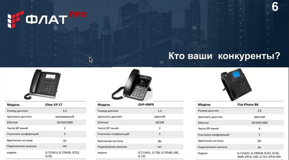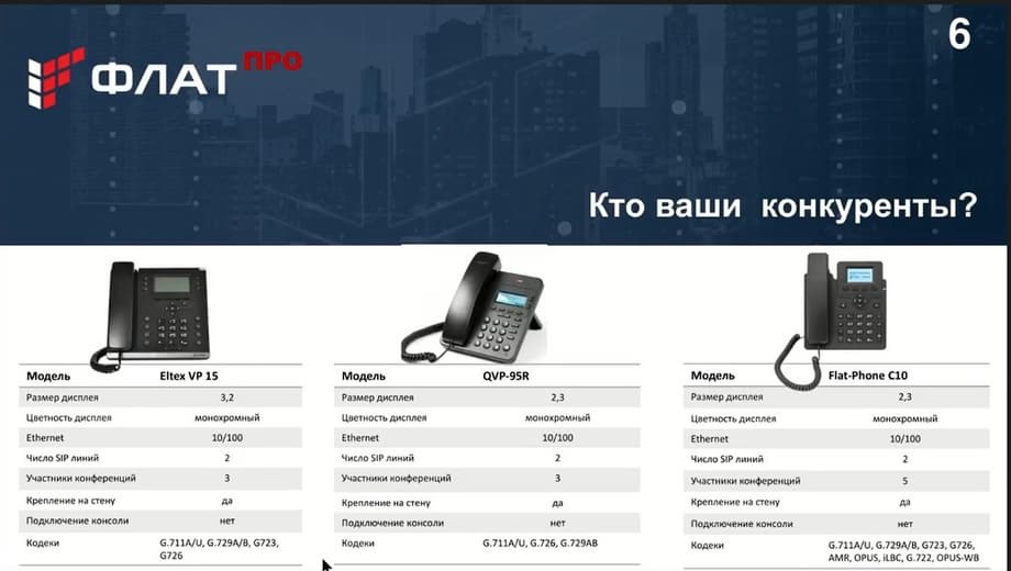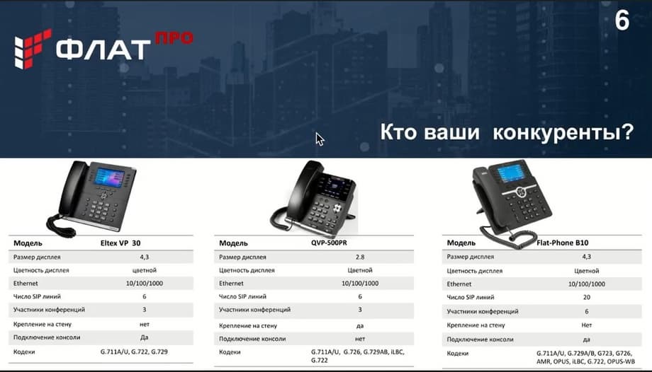 Very often, when we receive a technical task, we need to quickly understand what customers are guided by, whether we can or cannot win in this competition, who the TOR was written for, what the customer is guided by, what he initially chose, that is, whether it is worth fighting there. If we talk about junior models, then the key difference that ELTEX phones have is the size of the display. Their display is larger than ours. But, if we take our phones, then the set of codecs that we support and are ready to offer the customer is the largest. This is what concerns junior models. And at the same time, a very important point that you need to pay attention to is whether the phone that is offered has PoE or does it need an external power supply. The cost of external power supplies for all three vendors is more expensive than ours. And, if Qtech power supplies cost slightly more than ours, then ELTEX power supplies cost significantly more, and therefore they always show their price separately. Therefore, when a customer compares the price just for phones, it definitely makes sense to show the cost of the power supply separately, because in this case the price comparison may be in our favor. There is just such a small trick of competitors, which I would like to draw attention to and share with you.