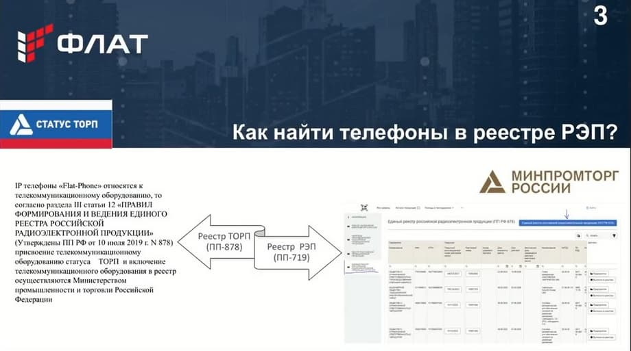 The Ministry of Industry and Trade has one basic register, this is the register of radio-electronic products, which was created according to government decree PP-719. And a little later, a separate register was created for telecommunications equipment, according to decree PP-878. And our phones, since they belong to the category of telecommunications equipment, are included in the TORP register, i.e. telecommunications equipment of Russian production according to decree PP-878. At the same time, if you go to the website of the Ministry of Industry and Trade, there is both decree PP-719 and decree PP-878, but even if you select the section decree PP-878 and type IP-phones in the search, you will not find a single phone there, neither ours nor anyone else's. A large blue button on the website of the Ministry of Industry and Trade, which says decree PP-878, allows you to fall into the TORP register only in this case, and there the search works normally for them, you can find IP-phones, IP-PBXs and other telecommunications equipment. Here's a life hack for you. The button is big, but for some reason no one notices it. We have a separate small instruction for the customer who cannot find the confirmation he needs, on one page: how to fall into the desired register in order to find the register numbers and get an extract from it.