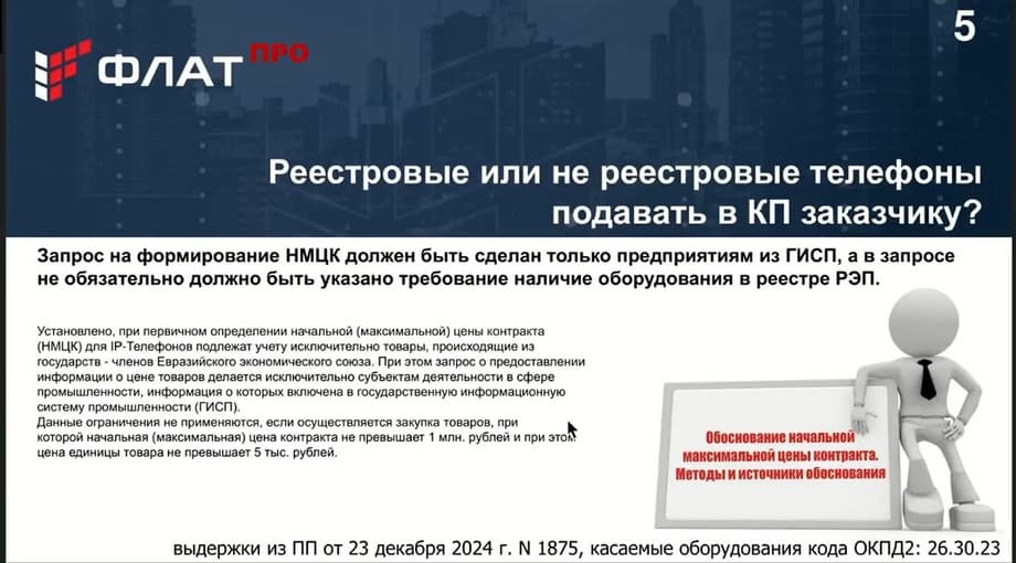 At the same time, this decree currently obliges them to ensure that if they receive an offer for registered phones when collecting commercial offers, they are obliged to put the contract price up for auction, taking into account the phones that are included in the registers of the Ministry of Industry and Trade, and their Russian origin is confirmed. But nowhere in this decree does it indicate that the customer, when collecting these commercial offers, is obliged to indicate to everyone whether they have requirements for TORP. And further, having received these commercial offers, the customer is not obliged to double-check whether telephone sets or other equipment exist or do not exist in the Ministry of Industry and Trade. This applies, by the way, not only to our phones, but also to PBXs and everything else. And what we encountered at the beginning of this year on the example of several Federal Penitentiary Services, they collect commercial offers without indicating in their requests that they need registered phones, they receive inexpensive offers for Chinese telephone sets. Then they say that we did not have a single offer of registered phones, so we put the contract price at 5, 6 or 7 thousand rubles per phone, and the budget has already been allocated, the competition for this price has been determined and nothing can be done. Therefore, colleagues, please note that when you now respond to requests for commercial offers, form for NMCC, be sure to submit TORP phones there. As soon as a TORP phone, at least one, no matter whose, ours or our competitors, appears in the customer's offer, they do not have the right to allow the Chinese to bid. For us, as Russian manufacturers, this is quite relevant, because it is quite difficult to fight on price with inexpensive Chinese solutions. I announced the reasons at the beginning of the event. Therefore, a very important point: if you plan to work with Russian solutions, then be sure to submit offers for TORP phones, TORP PBXs, TORP servers and everything you work with. In this case, the customer will have to reject competing analogues produced outside the Eurasian Union as non-compliant. If the customer does not receive a single offer for Russian analogues, he calmly allows everyone else to participate in the competition. This is such an important point that I wanted to draw attention to.