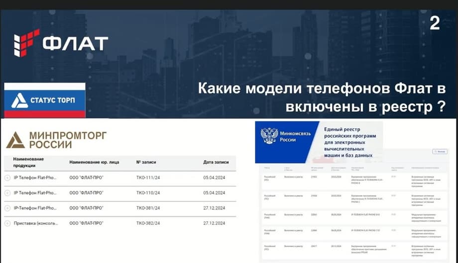 The firmware is modified, the microchips are modified. Donor phones for us are Deanstar phones, we do not hide this. Last year we officially talked about this. If we are talking about searching in GISP (state information system of industry), this is a search for suppliers, you can fall out of there, but some go to the register and search from the register. In general, searching on the website of the Ministry of Industry and Trade is a separate quest that can be done in different ways, because some of our customers say: "Are your phones really in the register? We dug through the entire register and did not find you there." And where did you look? They were looking in GISP. You don't need to search for IP-phone in GISP. You need to search for Flat. There, the supplier will pop up, and you can already see all his products by the supplier. In general, there are nuances. But you can find us.